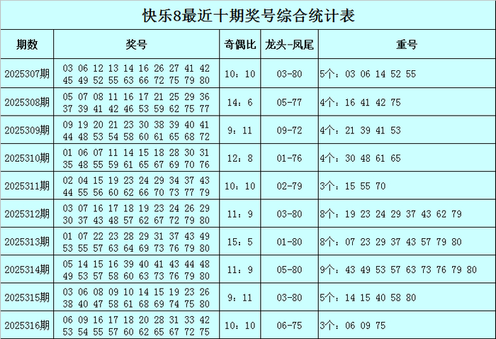 福彩快乐8第2025316期开出奖号:06 09 16 17 18 20 28 31 33 42 53 54 55 57 60 62 65 67 72 75,其中奖号奇偶比为10:10,出现3个重号06、09、75,开出连码16 17 18、53 54 55。