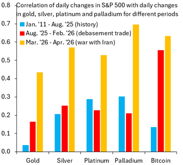 换而言之,黄金仍然没有像白银、铂金、钯金或比特币那样完全变成高风险资产,但其走势方向已经越来越接近风险资产,而不是投资者过去熟悉的独立避险工具。